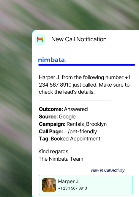 Build fully flexible email notifications by setting your own subject and body, and pull in any call details Nimbata captures, from Caller ID to marketing source.