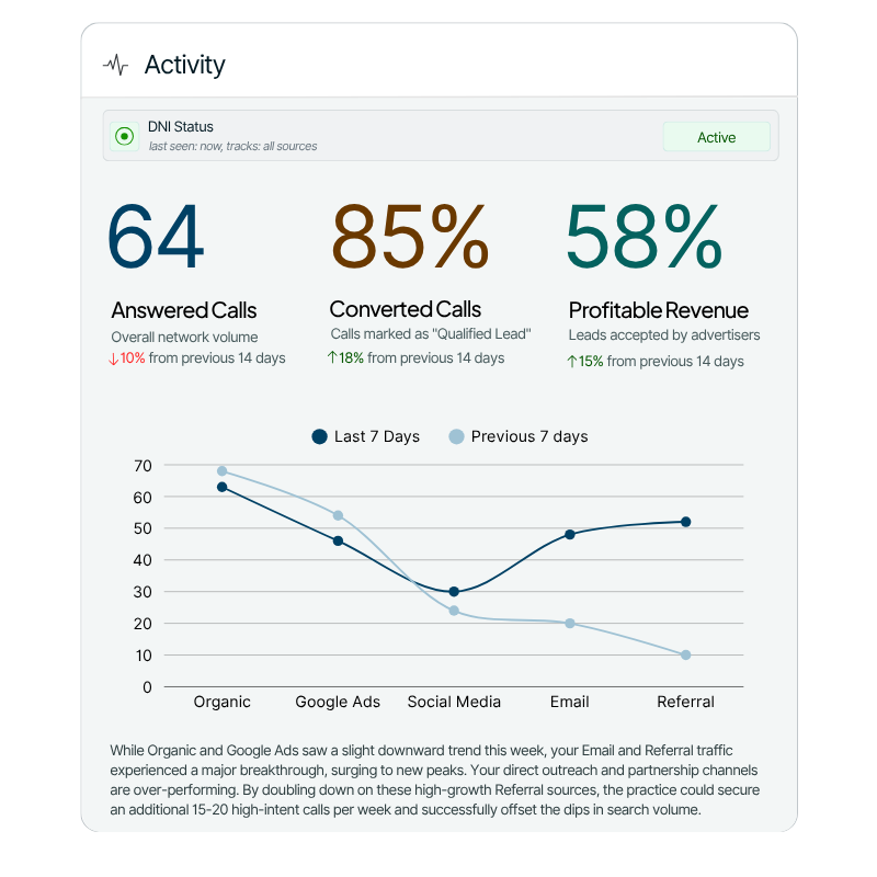 Most operators are set up within a day. Create your projects, assign tracking numbers, add your DNI script to your landing pages, and you're live. No hardware, no long-term contracts.